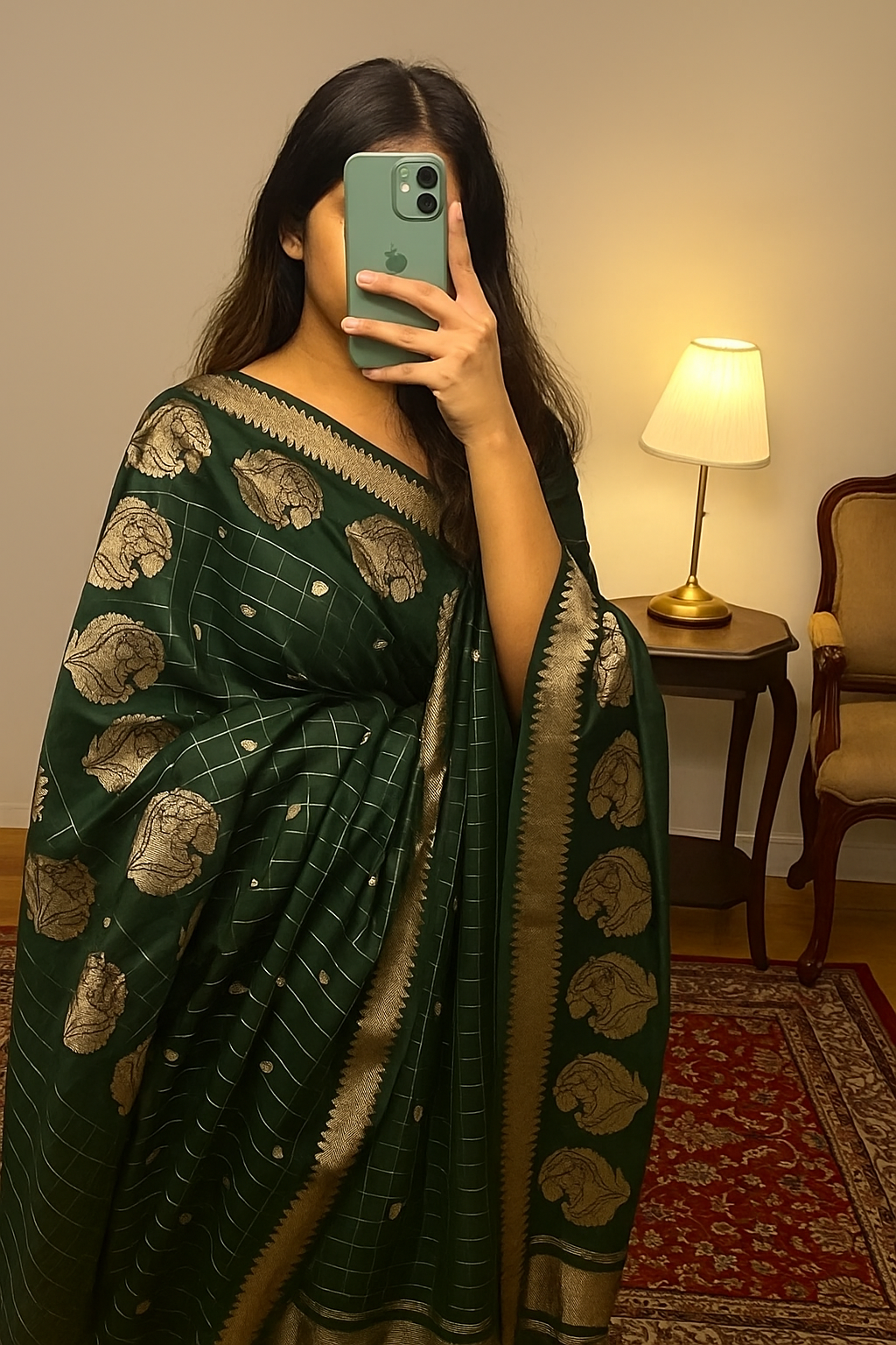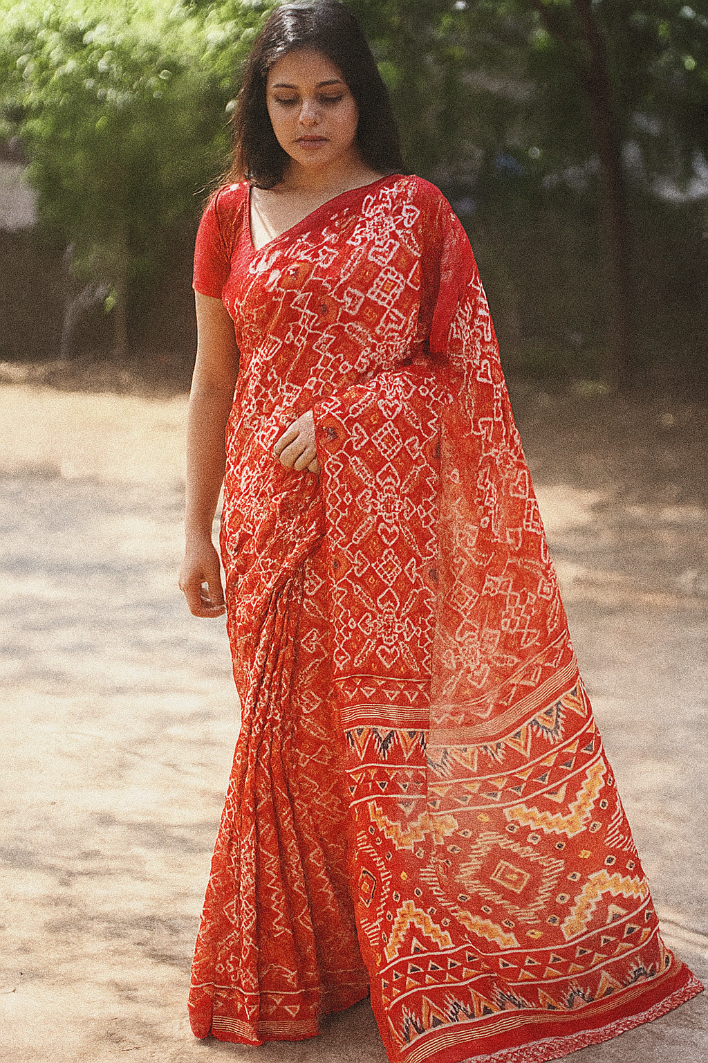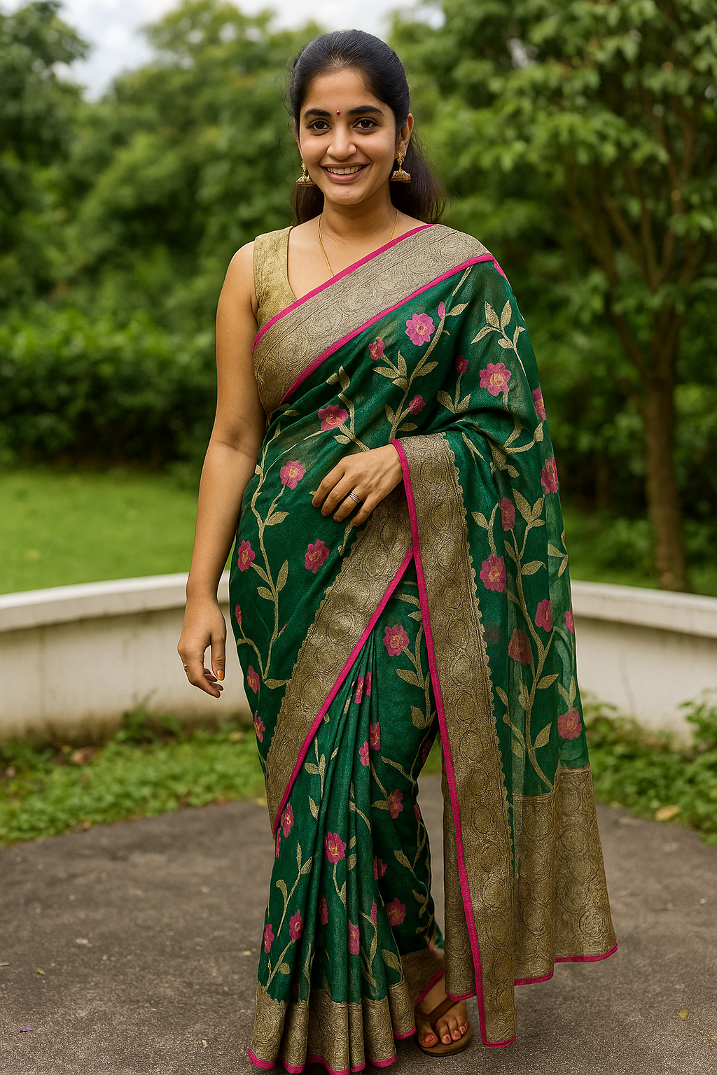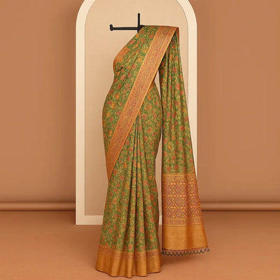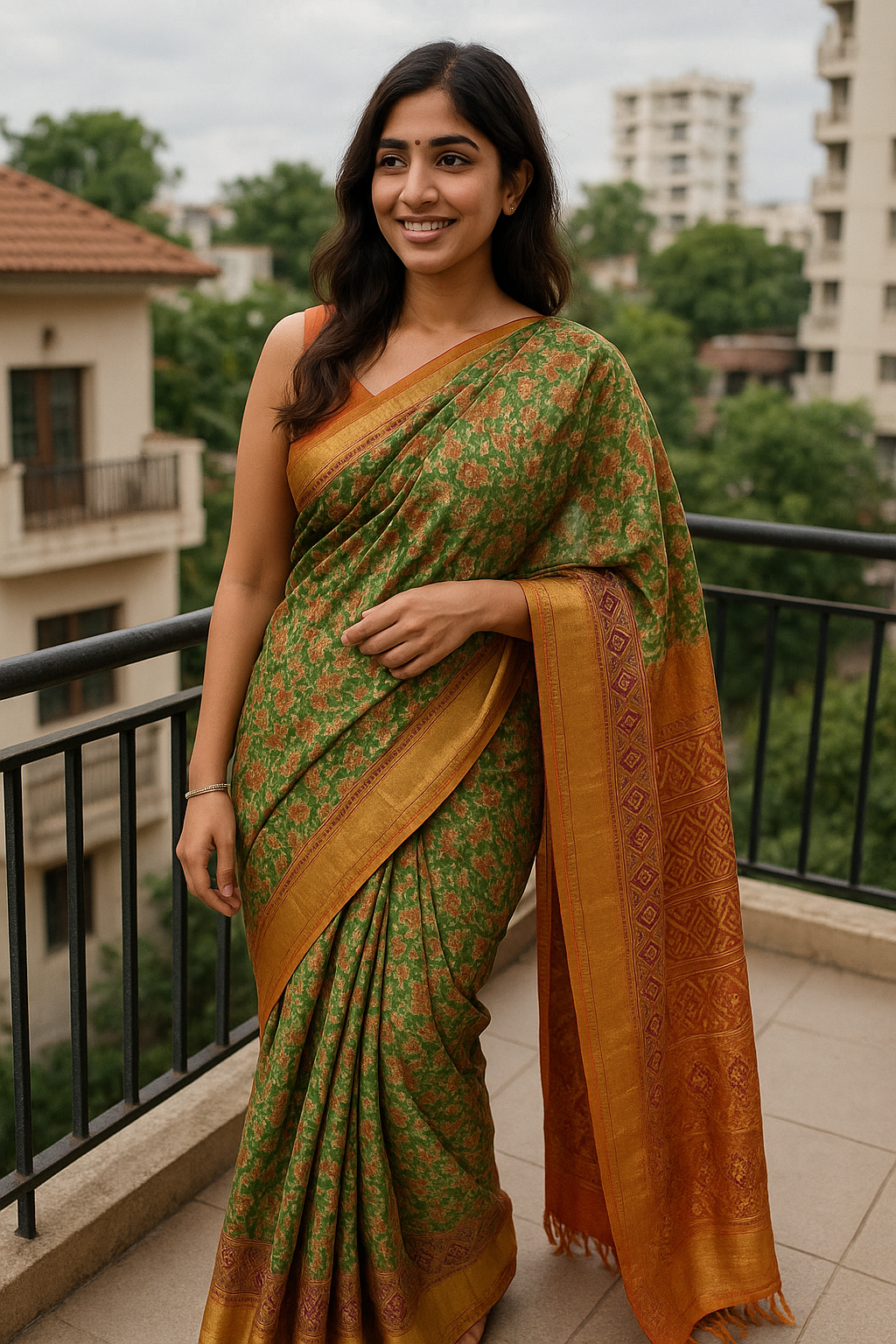 Radium Green Modal Print Silk Saree Ikkat print blouse